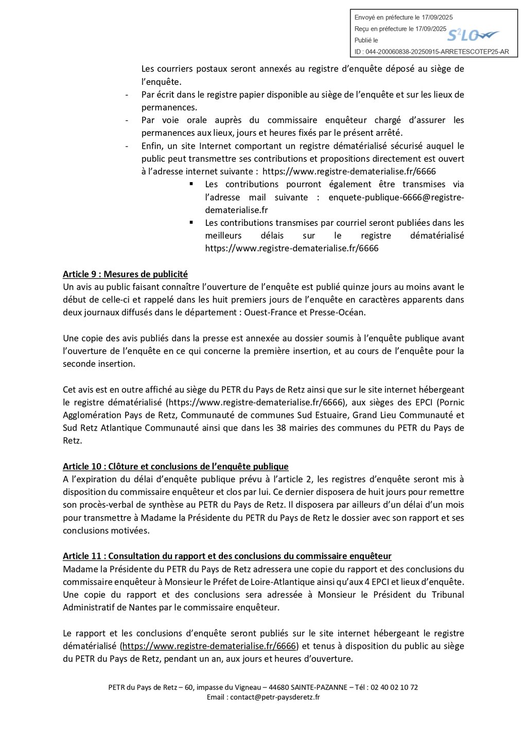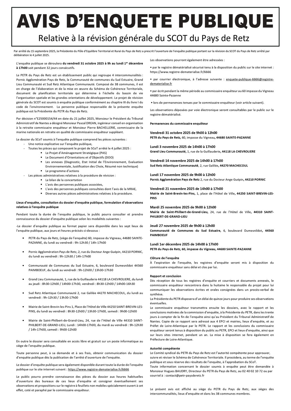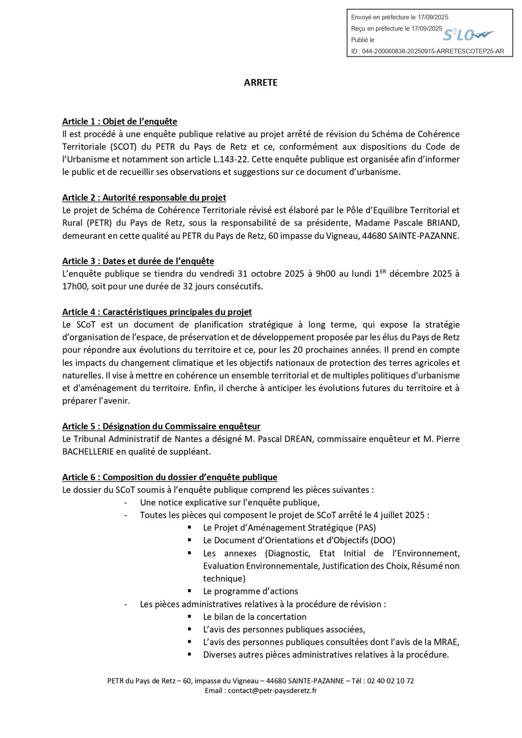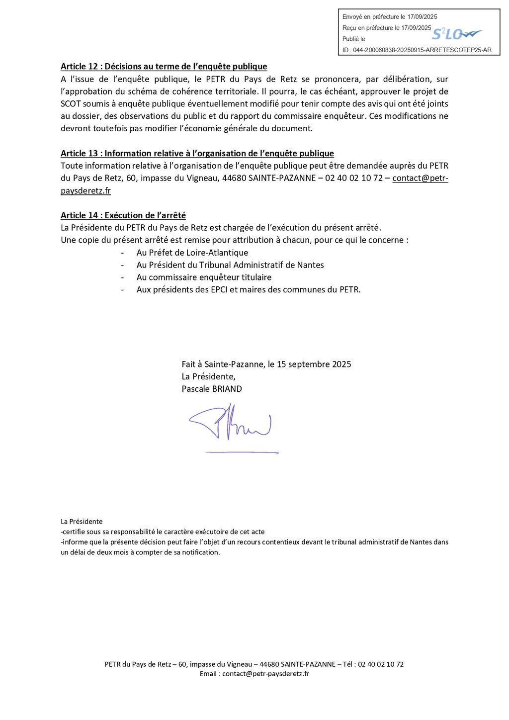A l’issue de cette enquête publique, et suite aux modifications qui seront apportées pour tenir compte de l’avis et des conclusions du commissaire enquêteur, les élus du PETR du Pays de Retz seront amenés à approuver le projet au printemps prochain.