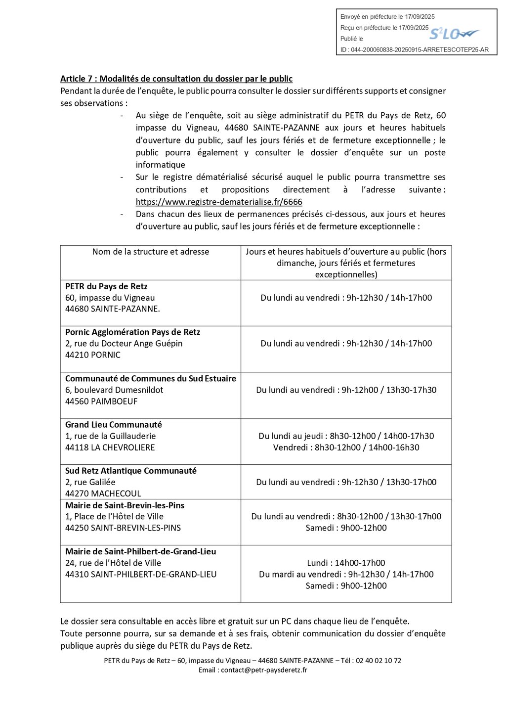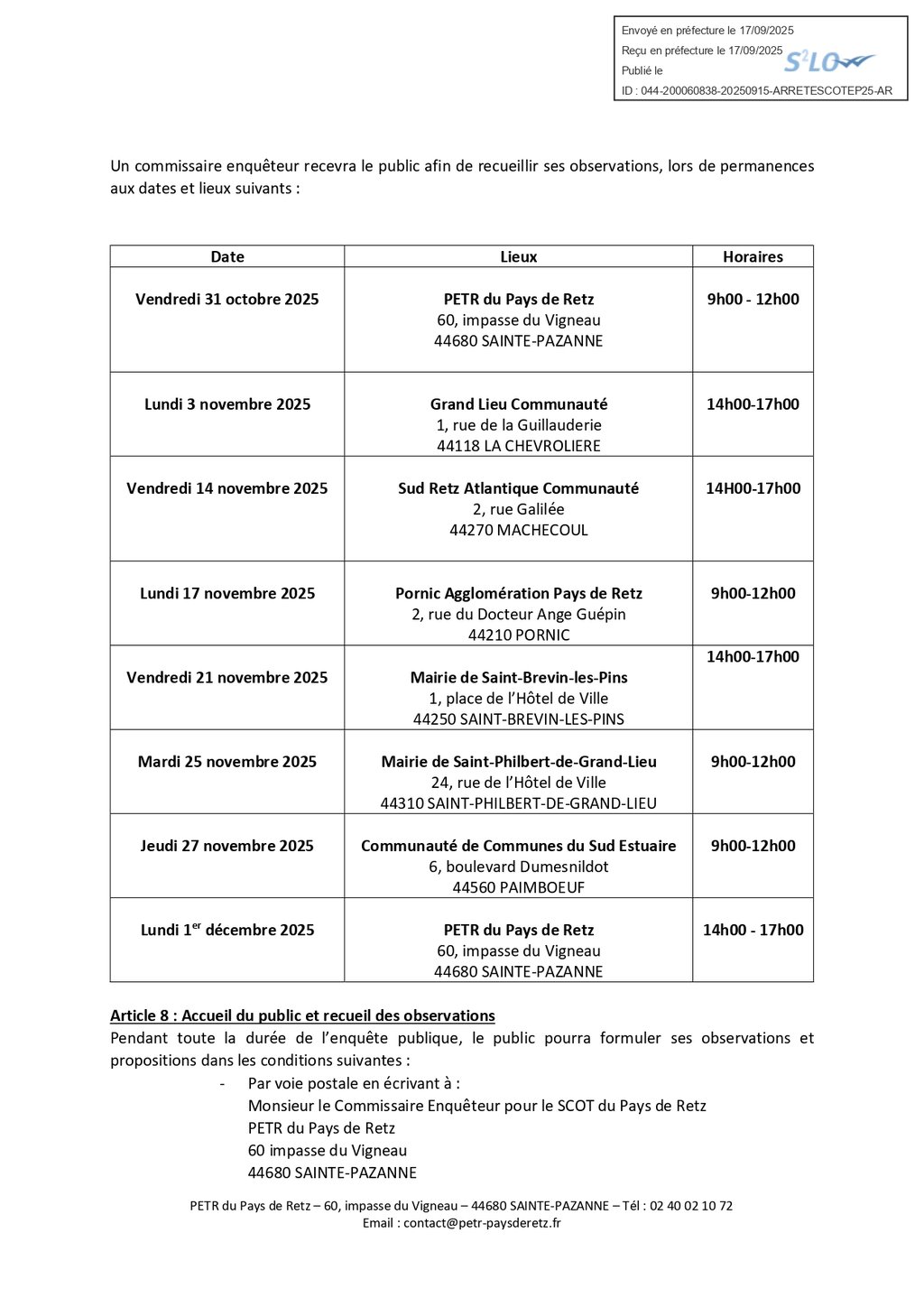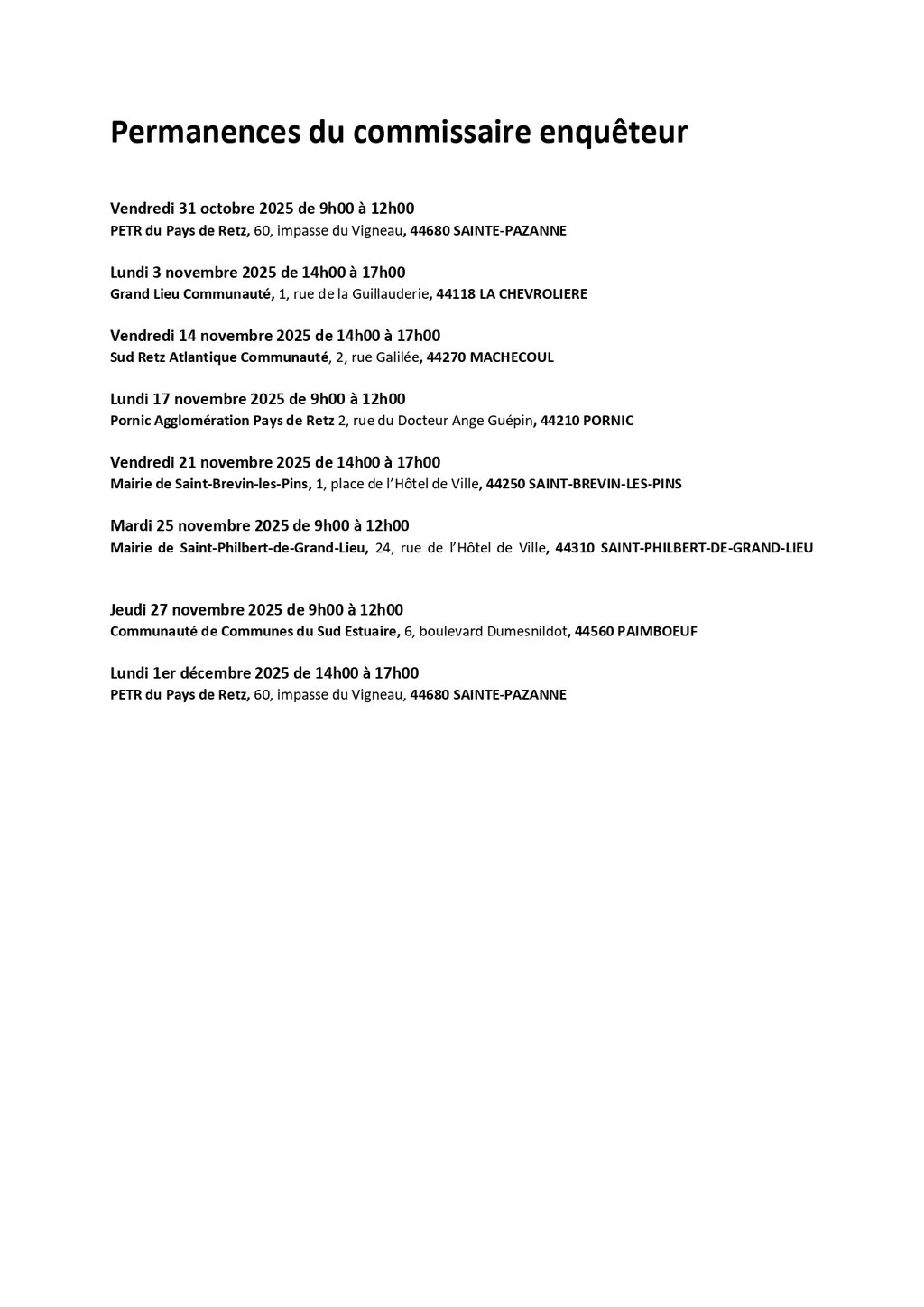 - Au cours de permanences du commissaire enquêteur: 7 lieux sont identifiés où des registres papier seront mis à disposition pour recueillir les observations et dans lesquels seront organisées 8 permanences.