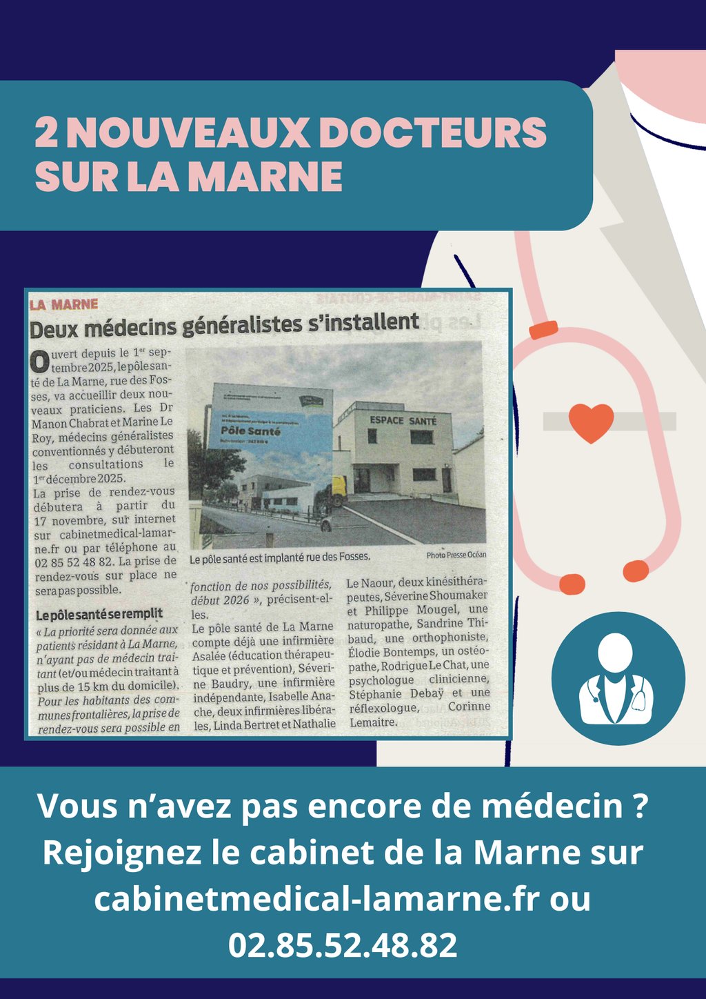 Prise de RDV sur internet sur cabinetmedical-lamarne.fr ou par téléphone 02.85.52.48.82