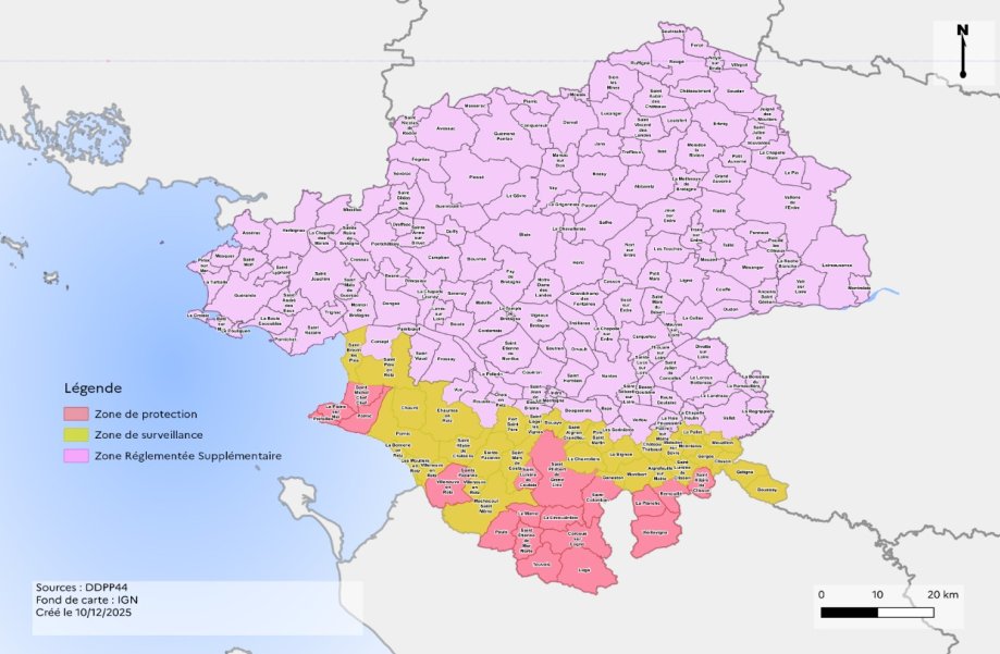Veuillez trouver ci-joint l'arrêté préfectoral n°DDPP/SPA/2025/449 du 12 décembre déterminant un périmètre réglementé suite à des foyers d’infection d’influenza aviaire hautement pathogène (IAHP) dans certaines communes de Loire Atlantique.