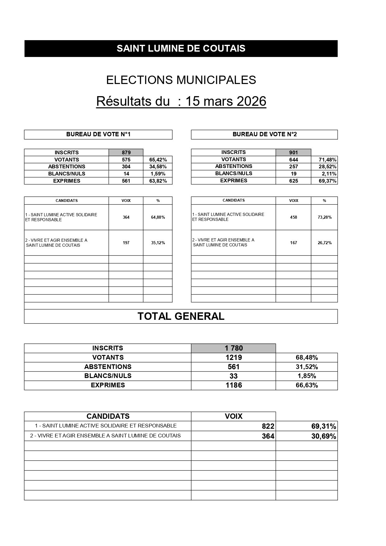• Liste SAINT LUMINE ACTIVE SOLIDAIRE ET RESPONSABLE - Mr COUDRIAU Bernard – 69,31 % — ELU