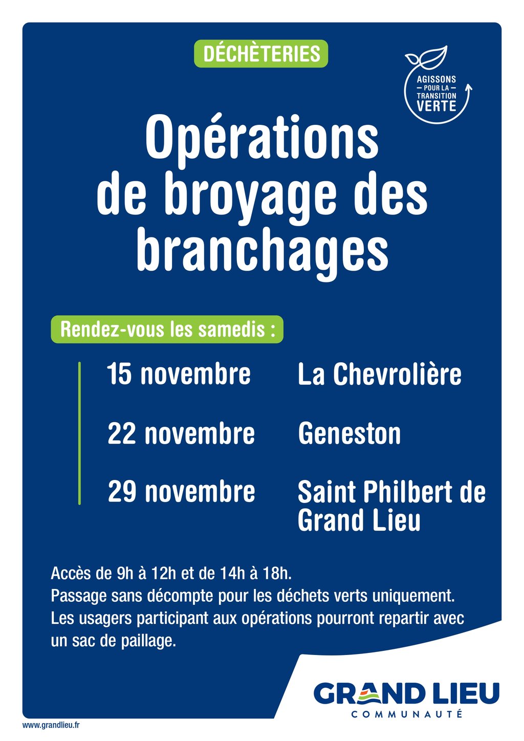 Grand Lieu Communauté agit concrètement en faveur de la réduction des déchets sur le territoire. Pour ce faire la collectivité organise depuis de nombreuses années, six opérations de broyage des branchages par an, avec trois sessions au printemps et trois à l’automne. Lors de ces opérations les habitants peuvent déposer leurs déchets verts sans que cela ne soit décompté de leur carte de déchèterie. Toutefois, si d’autres types de déchets sont apportés, un passage sera comptabilisé.
