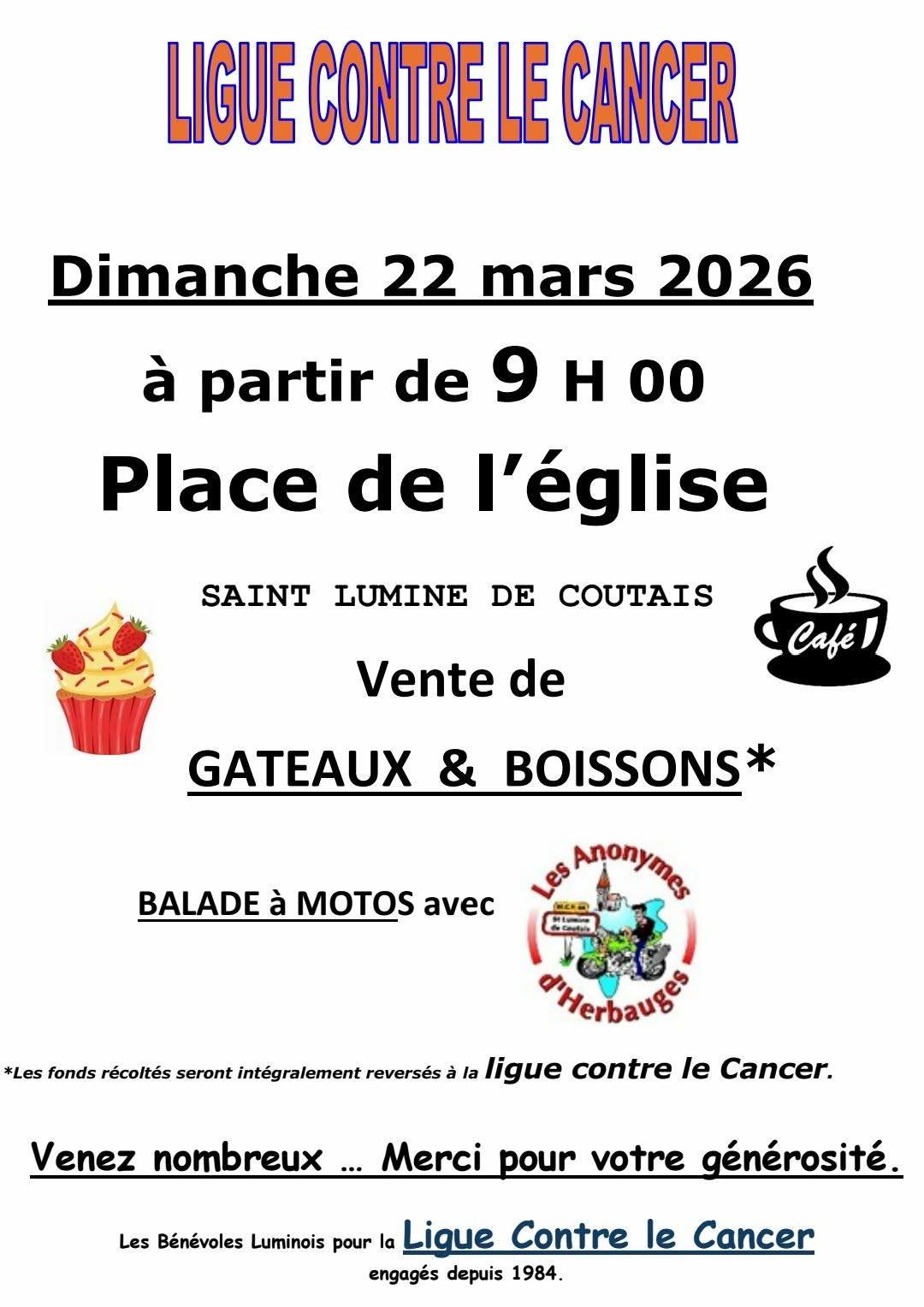 Les bénévoles de la Ligue Contre le Cancer organisent une vente de gâteaux et de boissons le Dimanche 22 Mars 2026 à partir de 9H sur la place Notre Dame du Châtellier.